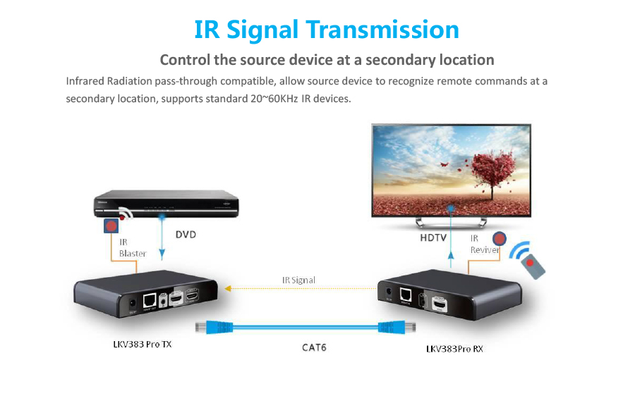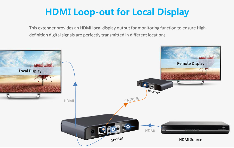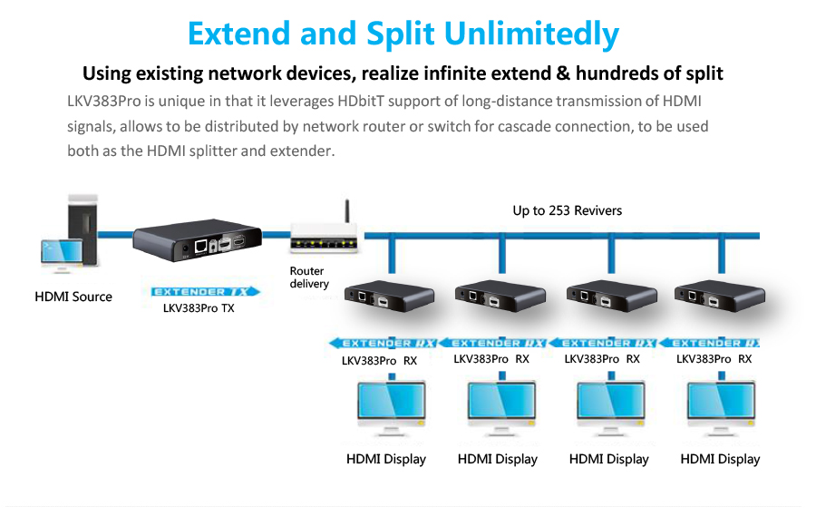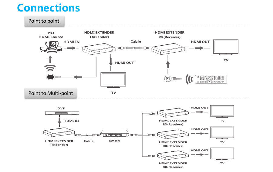Einföld leið að framlengja HDMI merki. Sendi má tengja beint i móttakara með Cat6 kapli, eða setja i samband við router/beini. Móttakari er síðan tengdur við sama net og tækin para sig saman sjálvirkt.