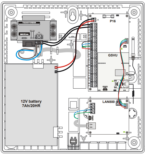 Plastbox með 20VAC spenni fyrir öryggiskerfi. Pláss fyrir rafhlöðu, stjörnborð, samskiptaeinninga ofl.
