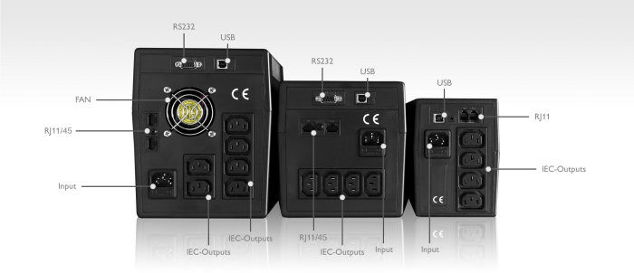 LCD skjár, USB hleðslu port, RJ45 Surge Protector.