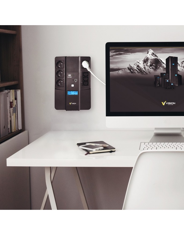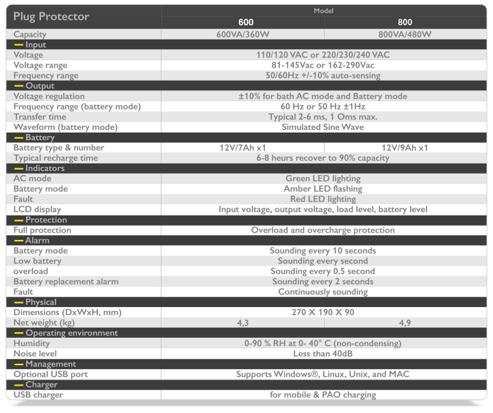 Litill varaaflgjafi með 3*Schuco tenglum sem ByPass og 3*C13 tenglum á varaafli. Að auki er 1 Schuko á varaafli. Afl á varaaflgjafa er 800VA - 480W. Innbyggð 9Ah rafhlaða.